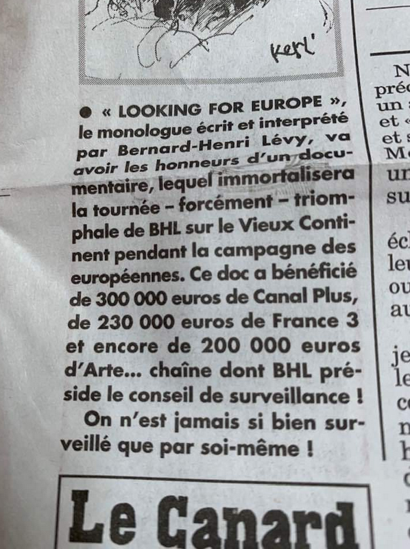 Coup de bec supplémentaire, le Canard enchaîné fait remarquer au passage que Bernard-Henri Lévy préside le conseil de surveillance d’Arte, sous-entendant une forme de conflit d’intérêts. «On n’est jamais si bien surveillé que par soi-même», ironise le palmipède.